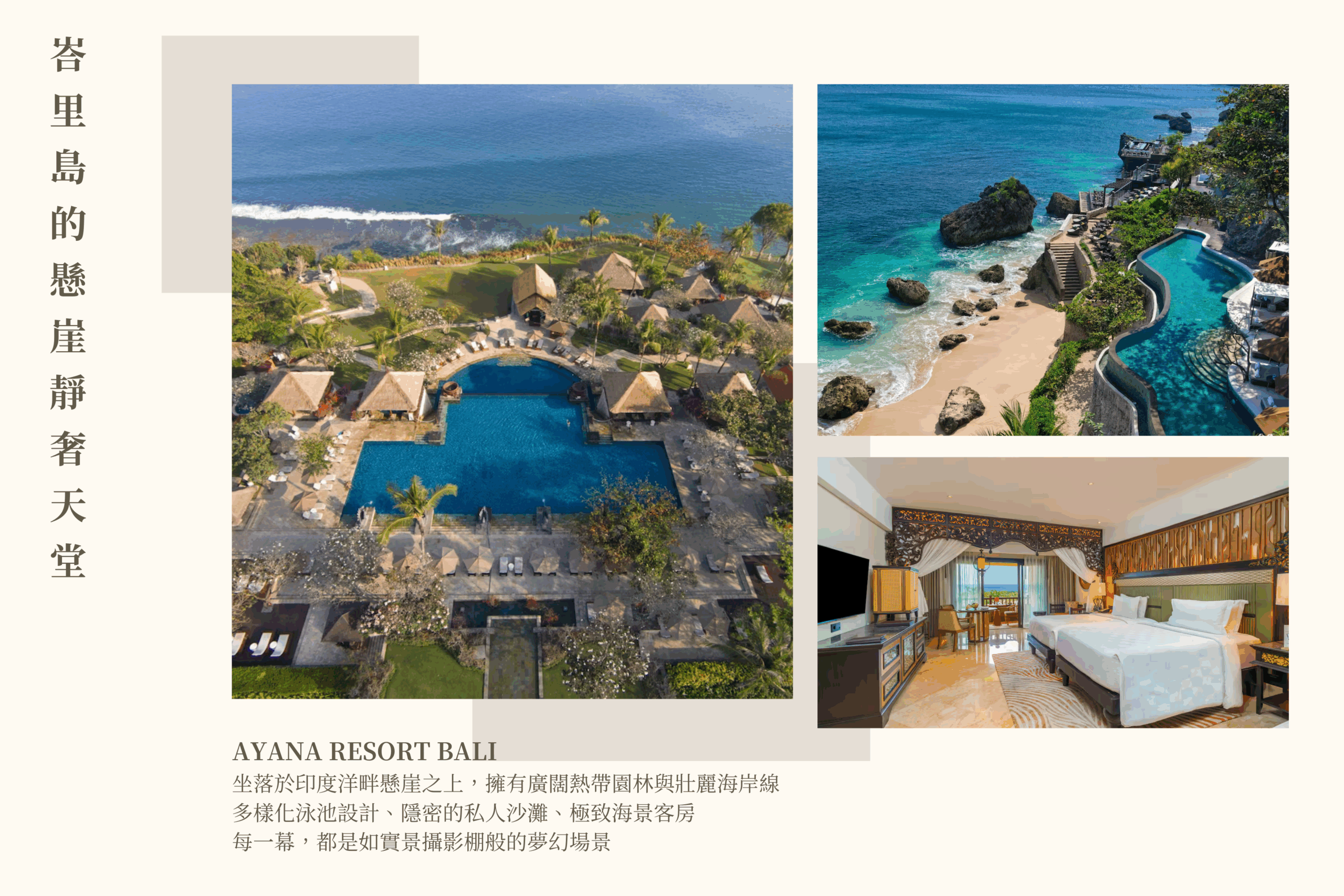 坐落於峇里島與印尼群島最迷人的海岸線上,AYANA Resort 精心打造每一段與大自然共舞的假期時光。從屢獲殊榮的海景別墅、無邊際泳池,到世界級水療與多元餐飲,AYANA 為旅人締造無可取代的島嶼記憶。無論是浪漫蜜月、親子同遊,或是沉浸在碧海藍天的身心療癒之旅,AYANA 皆以細緻款待與尊榮服務,邀您探索每一次感動。