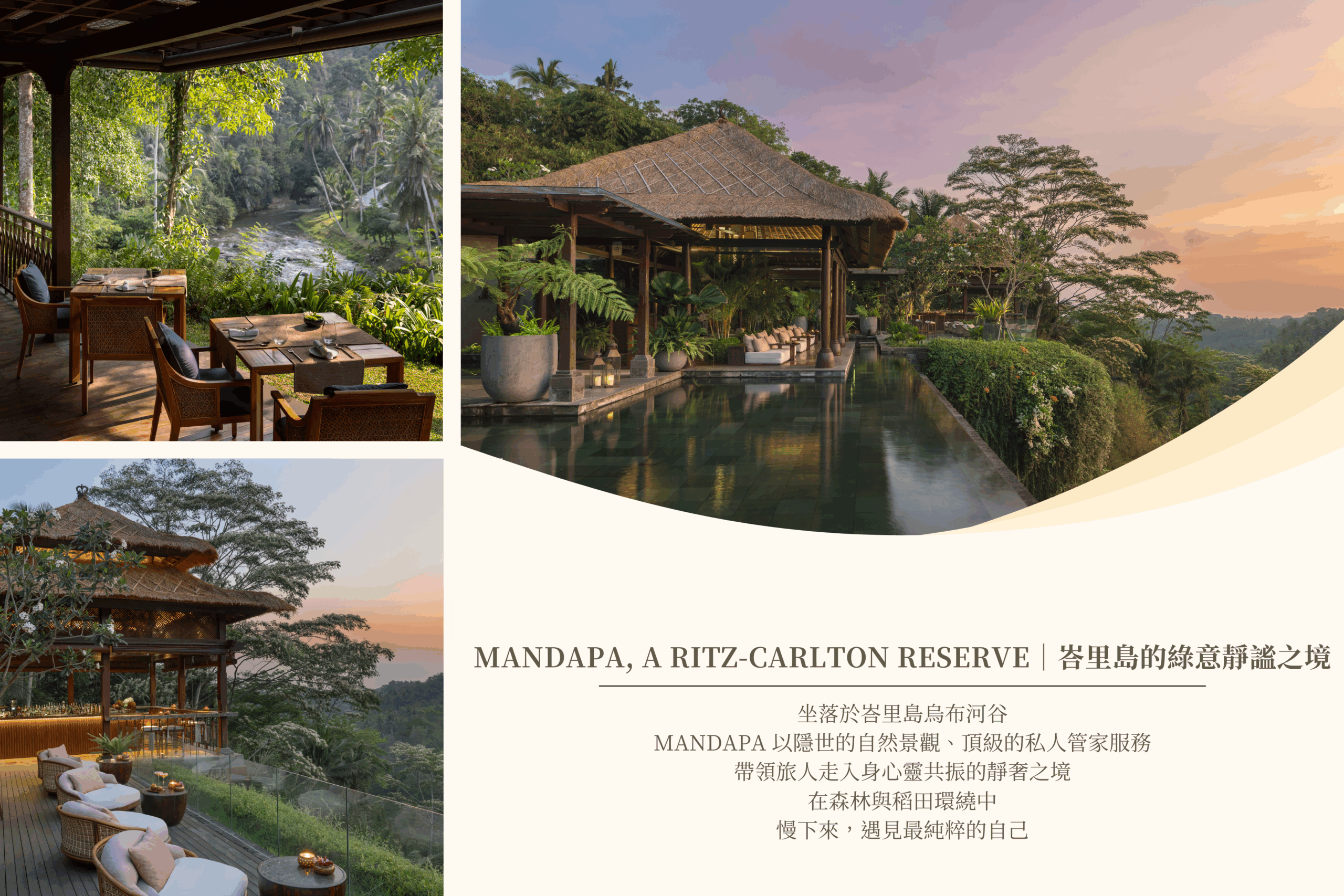 Mandapa隱藏在峇里島烏布 阿雍河谷 的奢華度假村,四周被綠意盎然的叢林環繞,營造靜謐美好的氛圍。度假村提供 寬敞別墅與套房,並設有私人泳池,讓旅客盡享私密尊貴體驗。這裡專注於 健康養生、文化體驗與個性化服務,無論是靜心瑜伽、水療療癒,或探索巴厘文化,皆能感受身心靈與大自然的完美連結。