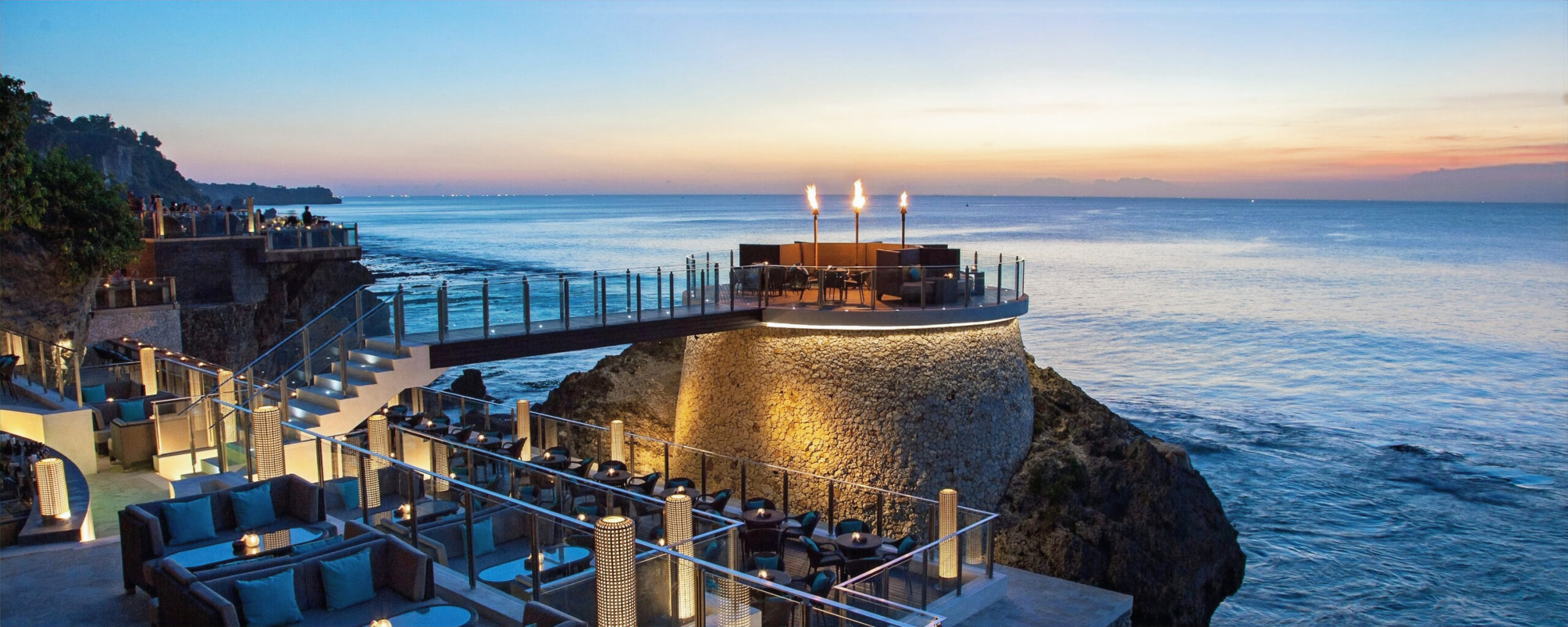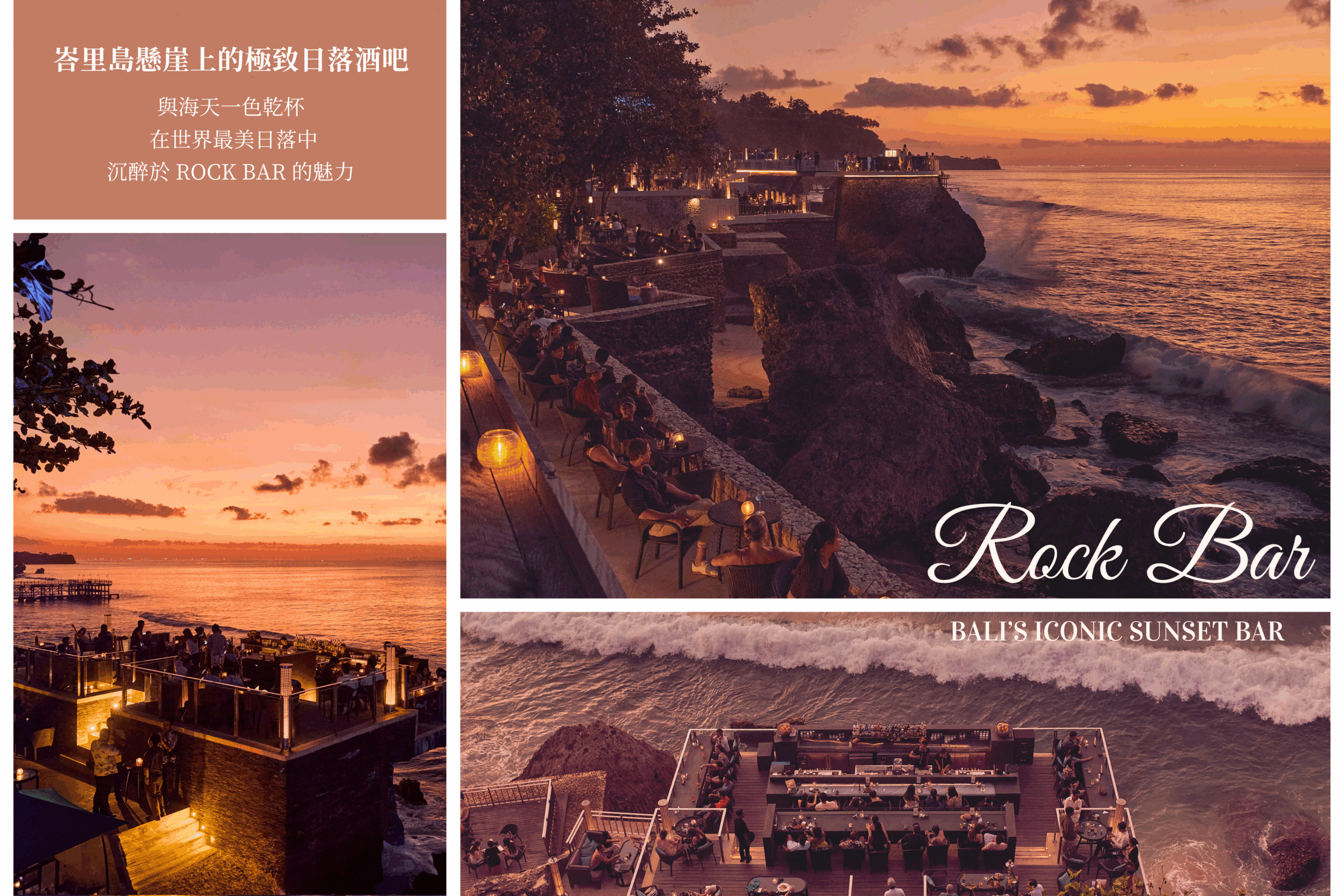 ROCKBAR 岩石酒吧—峇里島最夢幻的海景酒吧!搭乘 AYANA Resort Bali 的懸崖傾斜電梯緩緩下降,即可抵達這座距離 印度洋海平面14公尺 高的絕美酒吧。這裡擁有壯觀的海岸線與無與倫比的日落美景,讓人沉醉於夕陽染紅天際的浪漫氛圍。伴隨 DJ 現場音樂,品味特調雞尾酒與精緻小點,享受極致放鬆時光。