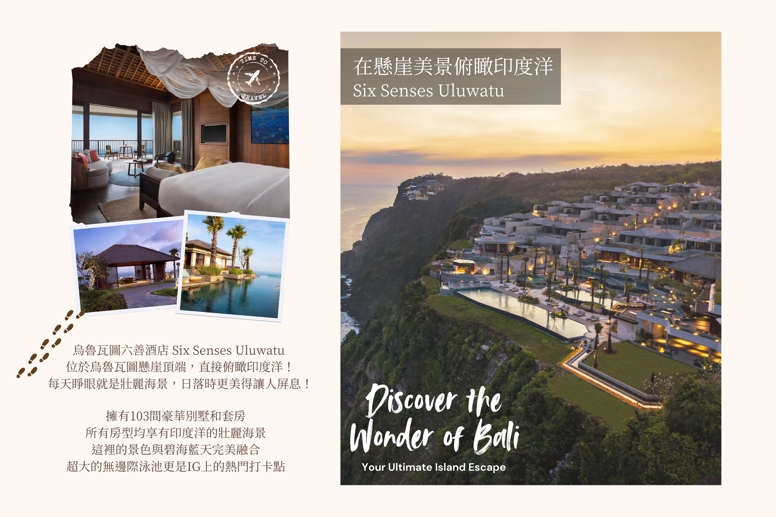 在峇里島的湛藍天海間,展開一段五日的奢華療癒之旅。入住六善酒店專屬海景套房,於金巴蘭灣靜聽海浪,感受晨曦的溫柔。走進烏布的綠意山谷,體驗皇宮文化、傳統美食與在地市集的熱情。每一次呼吸,都是自然與身心的對話;每一刻停留,都是專屬於你的奢華時光。