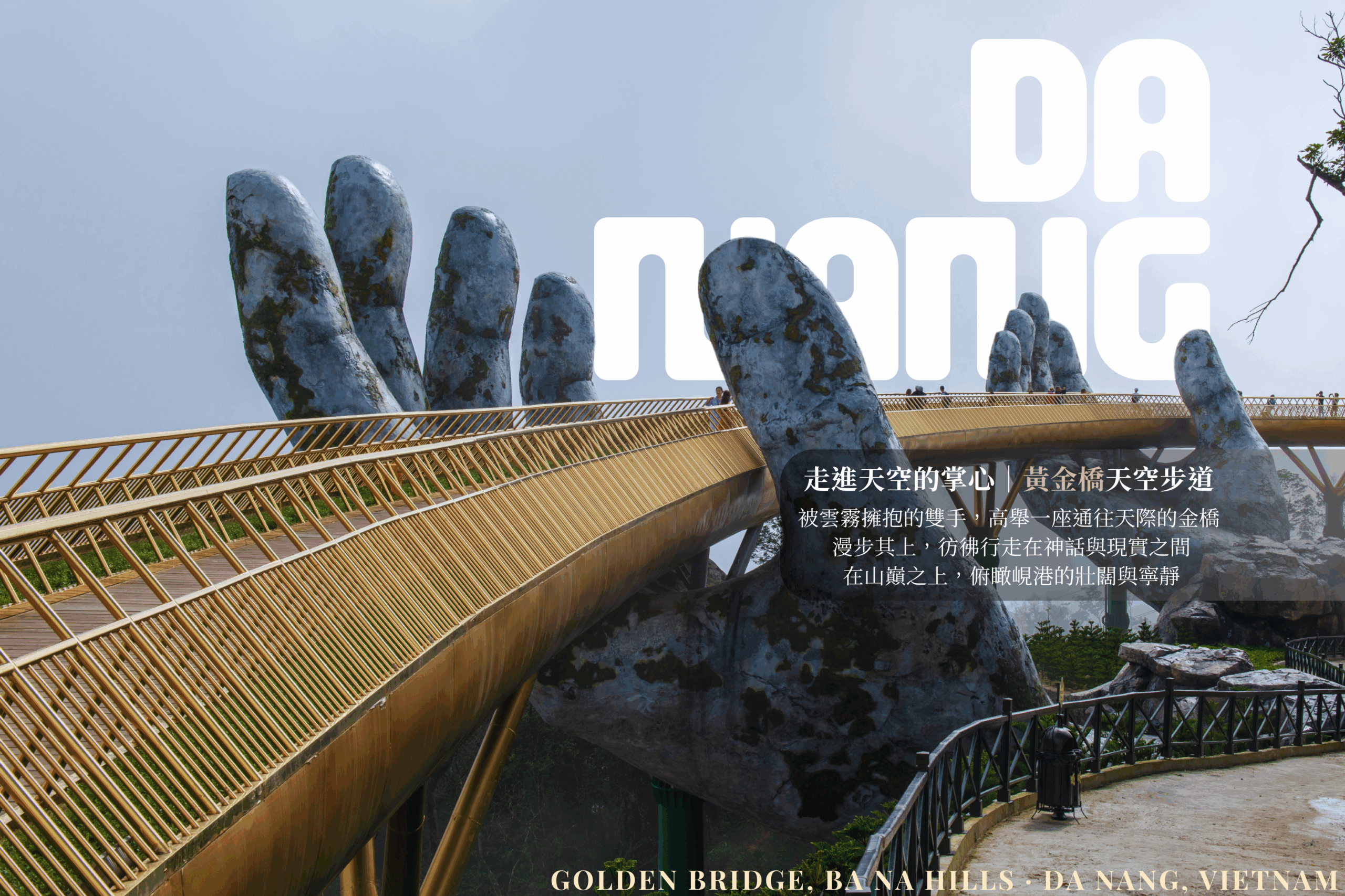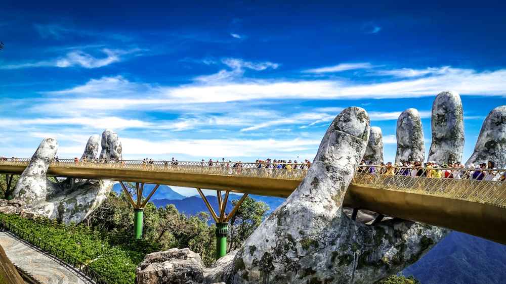 矗立於巴拿山上方海拔1400米處,看似被一雙巨大石手托著的金橋,橋面呈現典雅的金色,在陽光照耀下閃閃發光,與青山綠樹相互映襯,展現出絕美的視覺效果。瞭望周圍鄉村的壯麗景色,橋樑看似是用石頭雕刻出來的,實際上確是用玻璃纖維完成的。巨型石手從山巒間緩緩托舉起橋樑,彷彿自然之神的雙手為人類開啟通天之路。