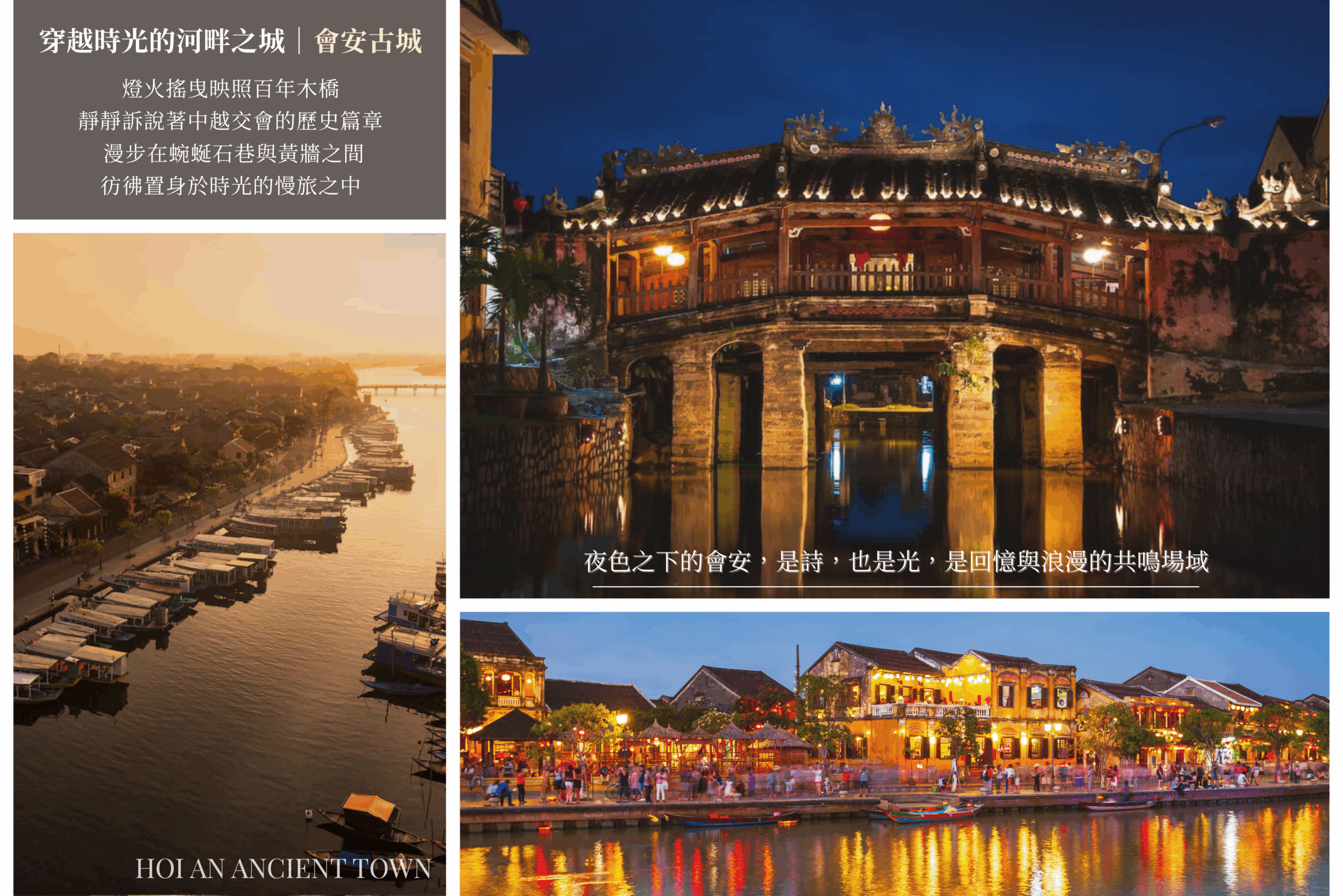 會安古城於17世紀時東南亞的國際港,也是當地越南主要貿易港。西元1999年的12月被聯合國世界文教組織列為「世界文化遺產」。入夜後,除了逛夜市瞎拼,輕舟夜航也是遊客喜愛的活動之一,遊河上放水燈別有一番滋味,河面上飄著許多小紙船上面裝著蠟燭,在此寫上心願點火後,用一根特製的竹桿放入水面,隨波漂流。