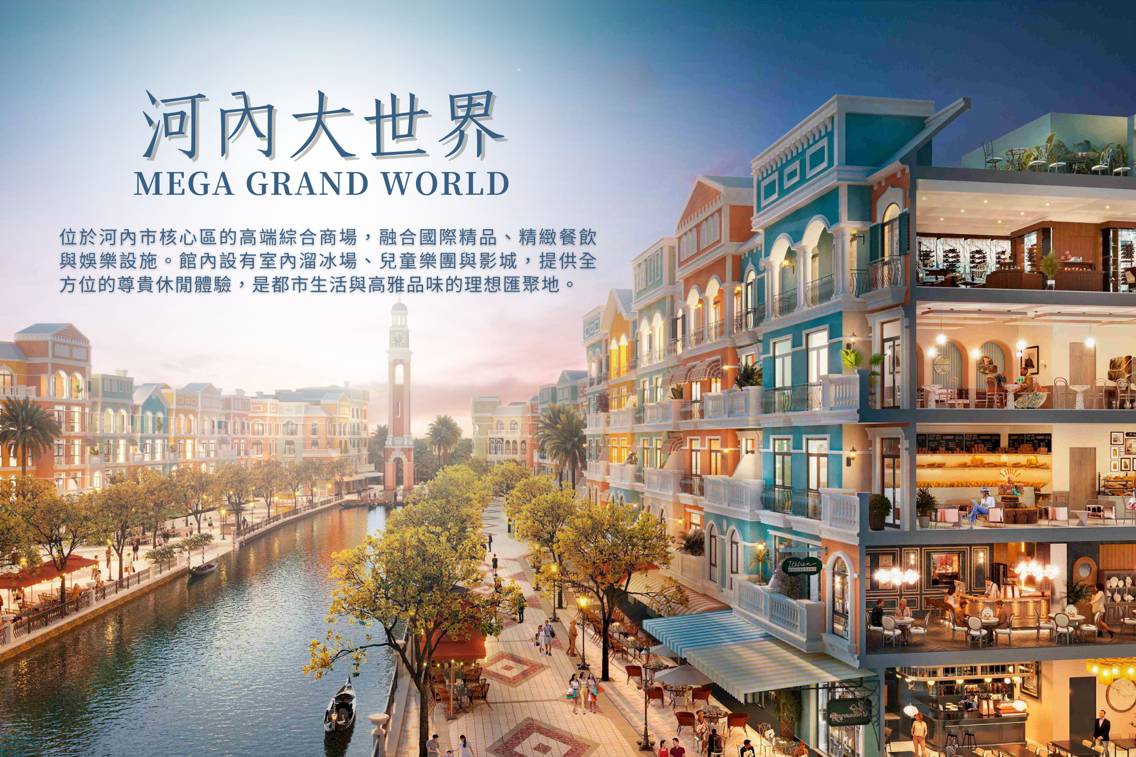 河內百萬大世界 MEGA GRAND WORLD是越南首都最新穎的大型綜合娛樂購物區,位於河內東北海洋城,融合威尼斯水都與韓國街區風情。佔地18.7公頃的園區於2023年底開幕,免費入園,成為當地年輕人和旅客的熱門打卡地。園區分為小威尼斯區與K-Town韓國區,遊客可乘貢多拉船遊830米長運河,欣賞哥特式建築與日落美景。